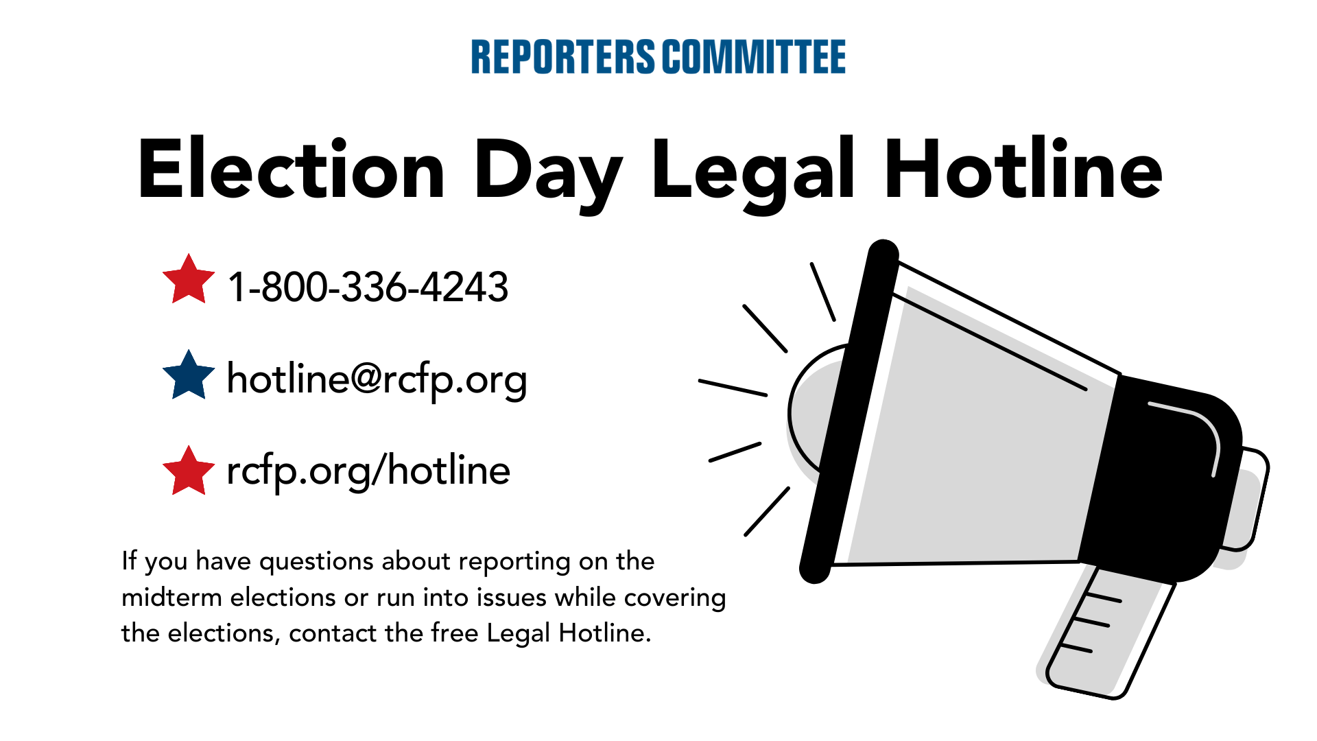 Contact the Reporters Committee Legal Hotline at 1-800-336-4243, hotline@rcfp.org, or submit a request through our online form if you have questions about reporting on the midterm elections or run into issues while covering the elections.