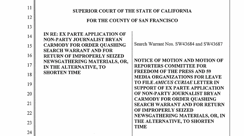 Sixty media organizations, led by the Reporters Committee for Freedom of the Press, are urging a California court to order the immediate return of San Francisco journalist Bryan Carmody’s protected work product, documentary materials and newsgathering equipment that were seized last week by San Francisco police.