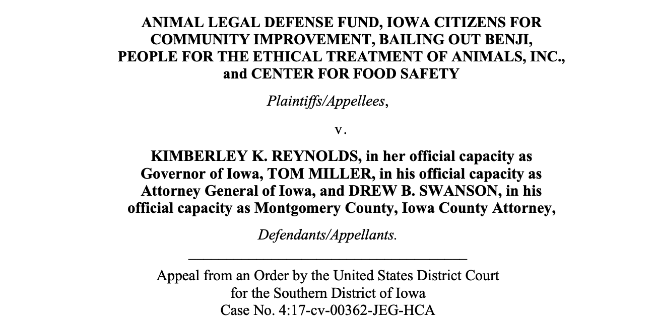 The brief also asserts that the statute “was adopted in reaction to undercover investigations and resulting media coverage that cast an unwanted spotlight on Iowa’s agricultural industry.”
