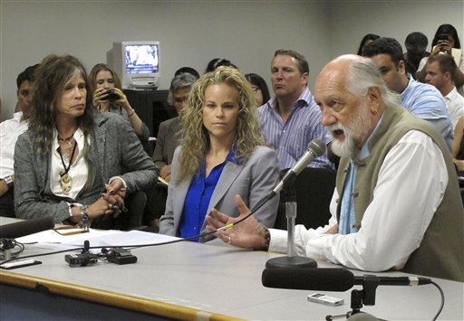 Steven Tyler, left, and Mick Fleetwood, right, testify about an anti-paparazzi bill. Tyler’s lawyer, Dina LaPolt, center, drafted the bill.