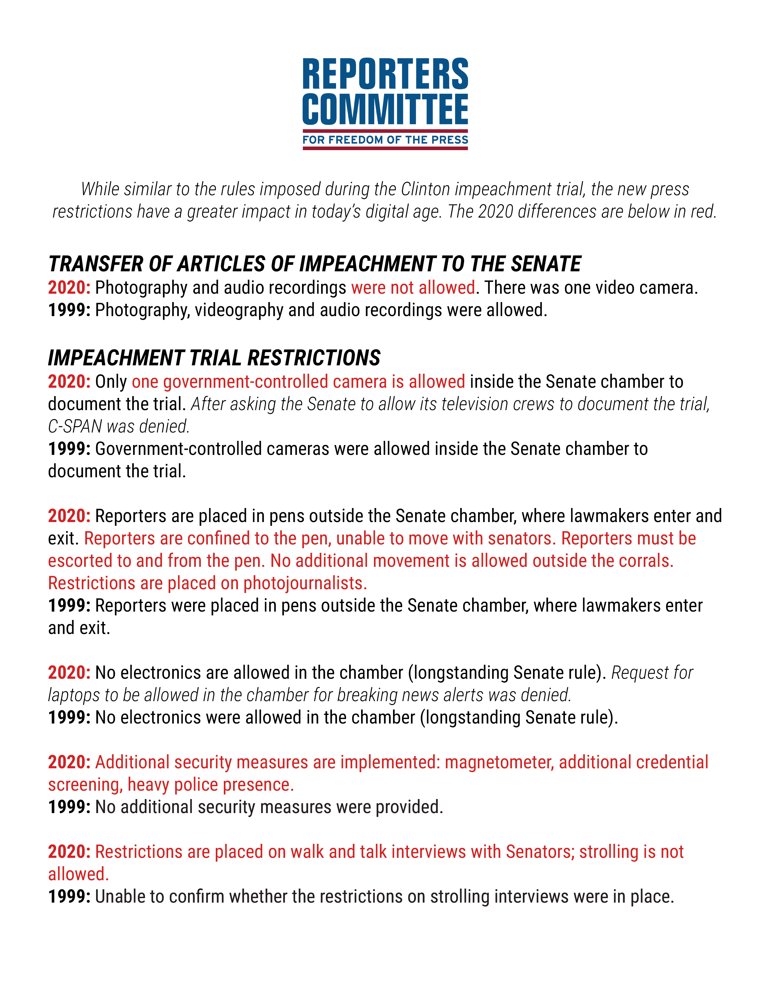 The impeachment trial is a matter of intense public interest for Americans of all political stripes, and senators from both parties have rightly criticized these restrictions. Senate leadership should acknowledge the added burden the restrictions place on digital-age reporting, and immediately rescind these harmful restrictions.
