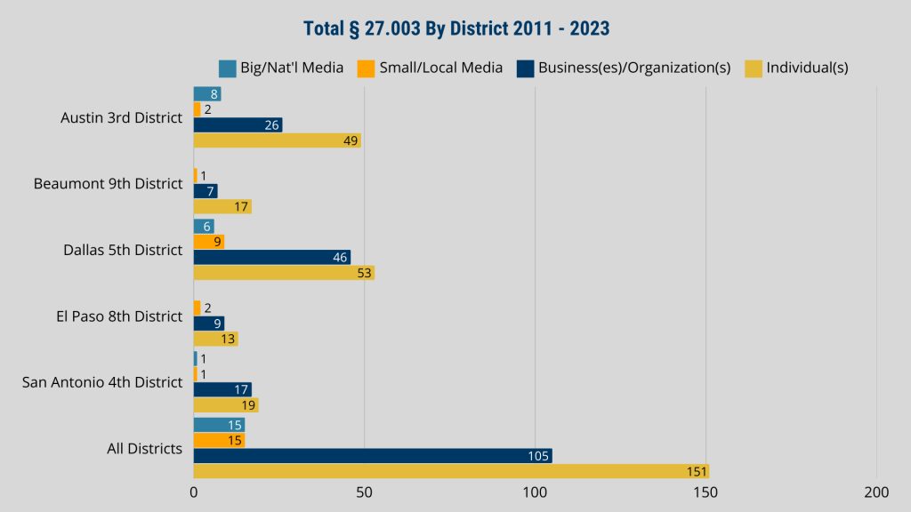 Using Westlaw, we then surveyed opinions featuring a TCPA motion to dismiss under section 27.003 of the Texas Civil Practice and Remedies Code across these districts. We attempted to categorize the movants as national media, local media, non-media businesses or organizations, and individuals. We then tallied those results across the same time period we looked at to determine the TCPA workload findings (2011 through 2023).